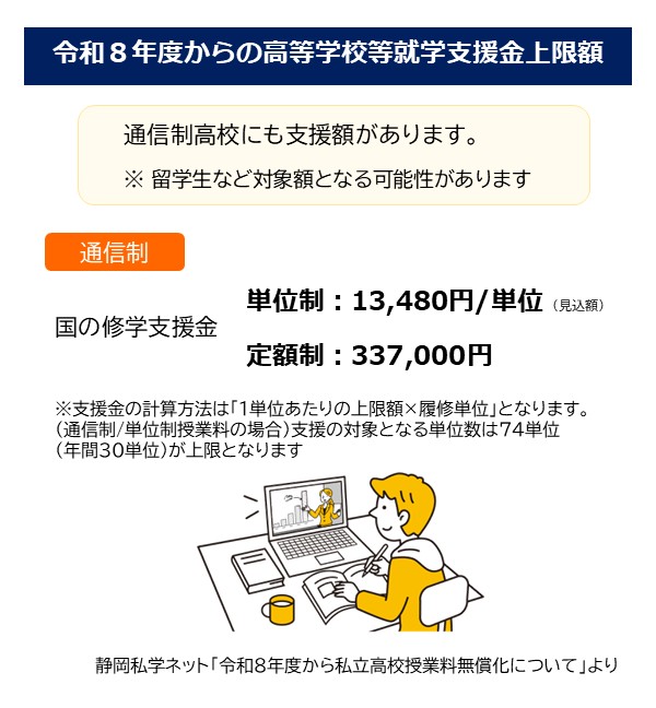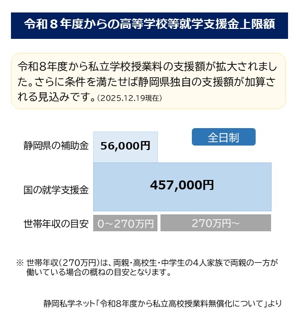 さらに静岡県独自の支援として、静岡県内の私立高校に通学する生徒さんは、世帯年収約270万円未満の場合に追加で年額56,000円(国の支援金と合計して年額513,000円)の支援を受けることができる見込みです(2026.2.1現在)