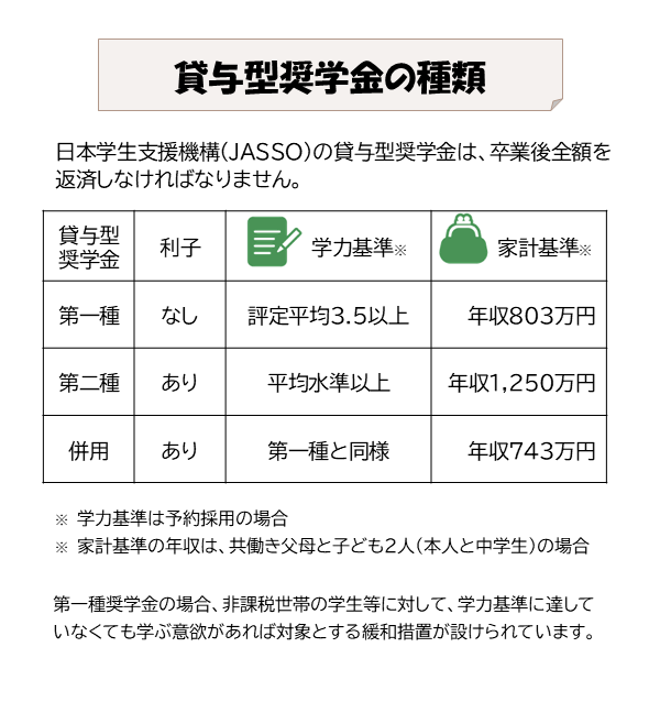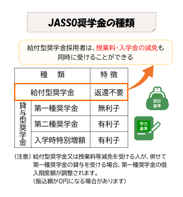国が実施するJASSOの奨学金は、給付型と貸与型の2種類があります。