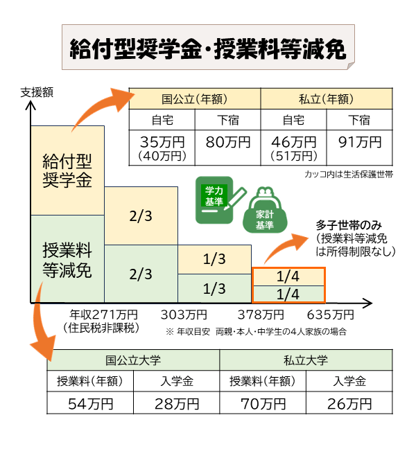 私立4年制大学(昼間部)理工農系へ進学する場合は、入学金86,700円、授業料年額233,400円を上限に減免を受けることができます。