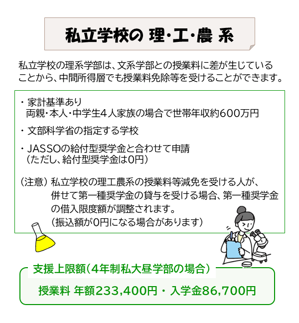 私立学校の理系学部は、文系学部との授業料に差が生じていることから、中間所得層でも授業料等免除を受けることができます。