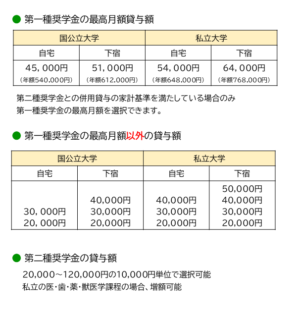 第一種奨学金の貸与額は、進学する学校の種別や通学形態によって異なります。